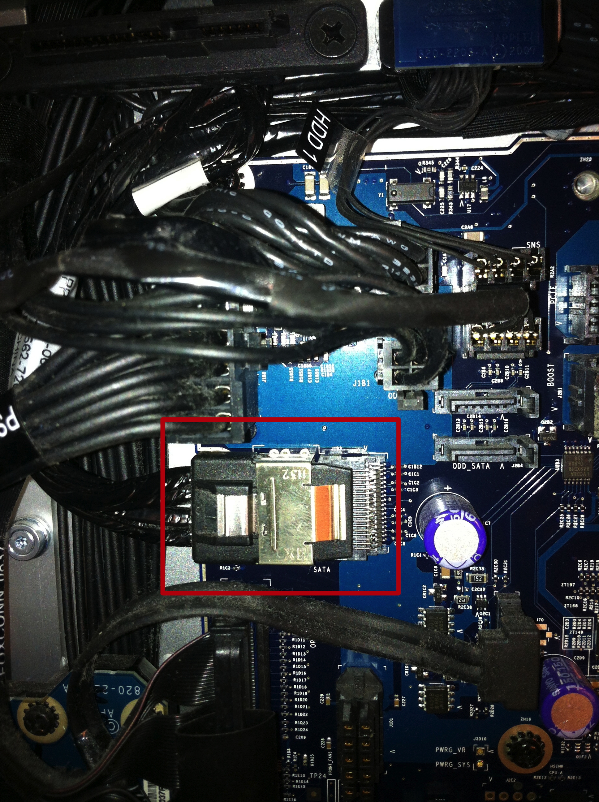 In step 7-1, and in the picture to the right, you see where the cable that you removed from the raid card is to be inserted on the motherboard. The iPass cable connection is within the red square after being inserted where it should be. Note the larger connector just above (slightly to the left) of the iPass cable connector. You just have to remove it, move the iPass cable under it. Connect the iPass cable and then reconnect the larger connector again. The iPass connector cable is short enough already so that it is definitely difficult to get it in place. But it must go below the larger connector cable. This is also noted in step 7-2.